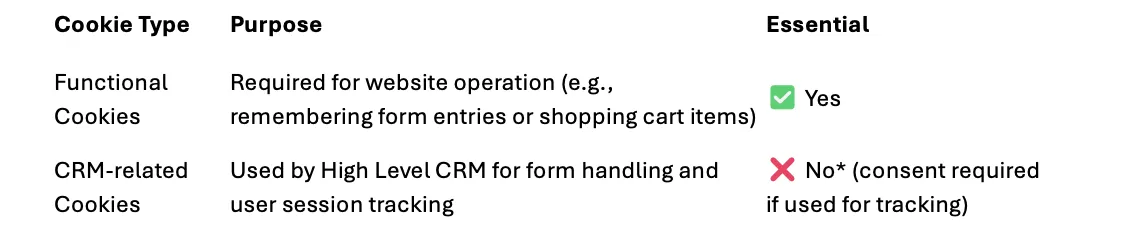 We may also use cookies through our CRM provider (High Level CRM) to manage form submissions, email preferences, and basic visitor behaviour tracking.